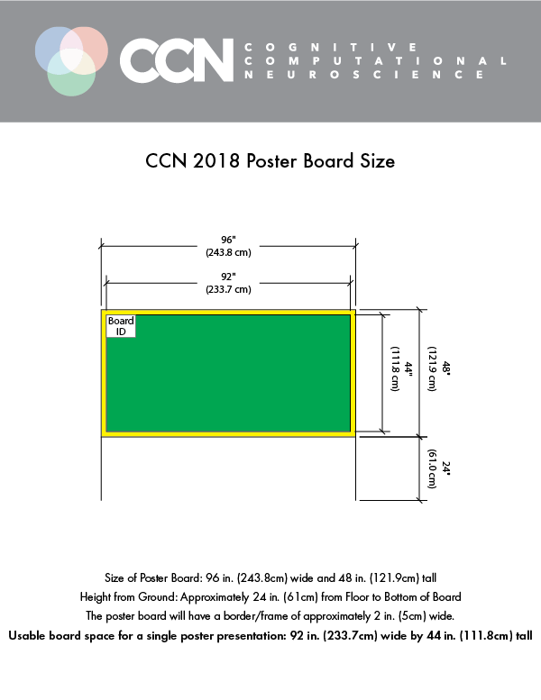 Rectangular boards will be provided, with the full face available for your poster. The usable area for a single presenter is 44 in. tall and 92 in. wide. The poster is not required to fill this entire space, but we recommend large posters to ensure visibility by your audience. Push pins or other attachment methods will be provided. Note that there will be no access to electrical outlets. Thus, any laptop/device that you may wish to use as part of your presentation should be fully charged.